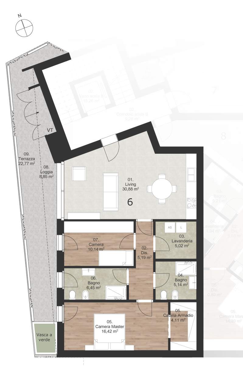 L’unità abitativa 6 si trova al primo piano, con un’ampia terrazza e un bellissimo loggiato, 2 bagni e 2 camere da letto su un totale di 115mq di superficie.