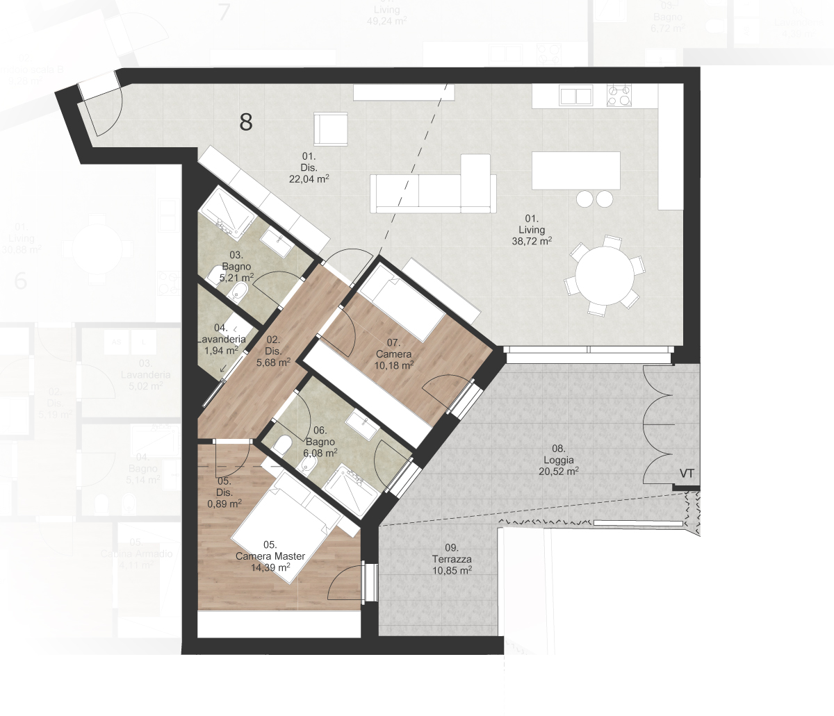 L’unità abitativa 8 si trova al primo piano, con una loggia, terrazzo e 2 camere da letto all’interno di 136mq di superficie totale.