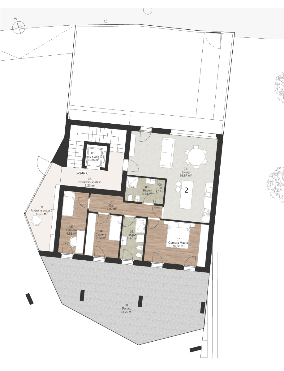 L’unità abitativa 2 si trova al primo piano, con un grande portico da quasi 64mq. Due bagni e 3 camere da letto contribuiscono a rendere perfetta quest’abitazione all’interno di 154mq di superficie totale.